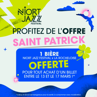 À cette aoccasion, on lance une offre pour la Saint Patrick ! Du 13 au 17 mars, pour tout achat d’un pass*, une bière IPA Niort Jazz Festival est offerte !